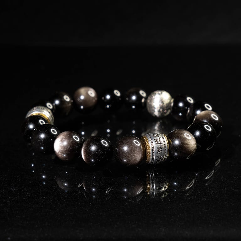 This stretch bracelet features Silver Sheen Stone, accented with silver-plated charms and a Tibetan “6-Character Mantra” charm, symbolizing protection, focus, and spiritual guidance. It serves as a reminder to align your energy, embrace mindfulness, and connect with higher wisdom.